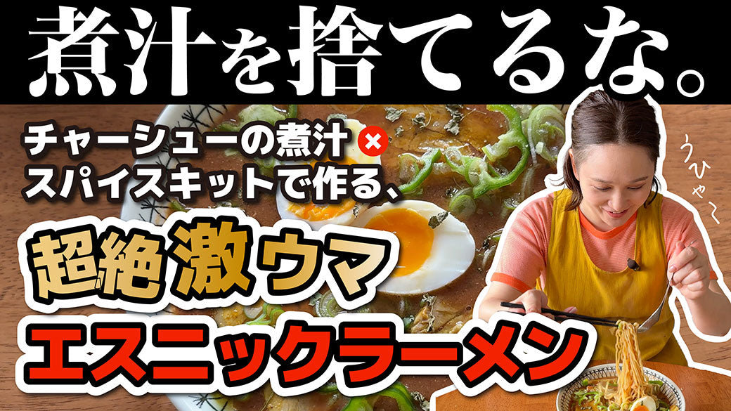 エスニックトマトラーメンスパイスキットのアレンジレシピです。簡単に作れることが売りのこちらのスパイスキットを、豚バラブロック肉を使って「手作りチャーシュー」と「豚スープ」を作り、さらにお店レベルのめちゃくちゃ美味しいラーメンにしちゃいました。もうとにかくマニアックレシピ。時間がかかる。でも絶対美味しいから、やってみて欲しいです笑 ▼ 動画で作り方をチェック このレシピの使用商品 エスニックトマトラーメンスパイスキット 商品詳細を見る 材料(1人分)チャーシューと豚スープは3-4人前作れます エスニックトマトラーメンスパイスキット1人前 無塩トマトジュース200cc お味噌30g ごま油大さじ1 生麺1玉 トッピングお好みで 豚バラブロック肉300-400g しょうが(生orチューブ)適量 ローリエの葉2-3枚 チャーシュー用漬けダレ ブレンドスパイスorガラムマサラ大さじ1 お醤油(めんつゆでも可)30cc 水70cc...