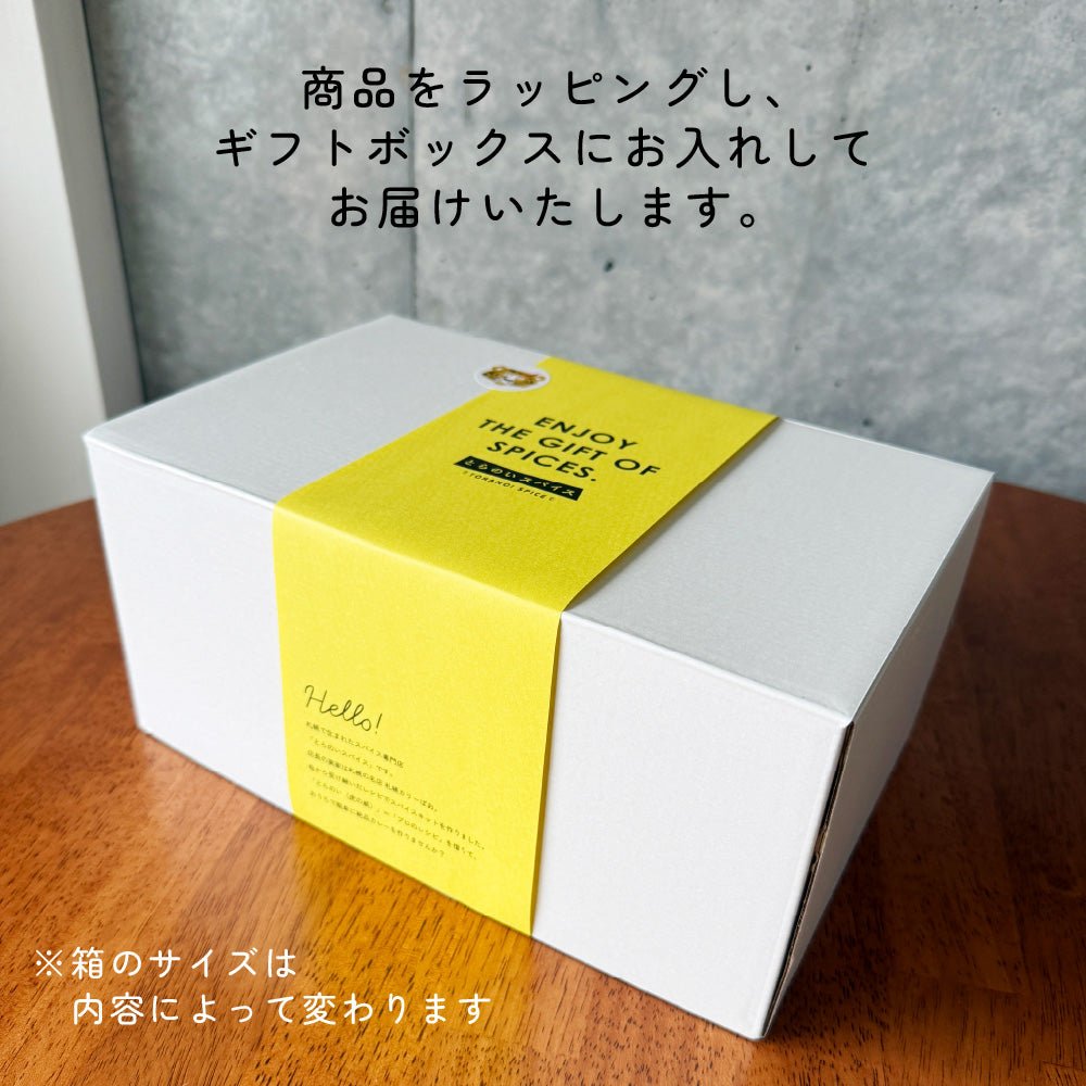 専用のギフトボックスに、ブランドカラーをイメージした「黄色いもけもけ(紙クッション)」を敷き詰めてお届け。スパイスにはおしゃれなオリジナル帯を巻き、開けた瞬間にパッと心が華やぐ仕上がりです。